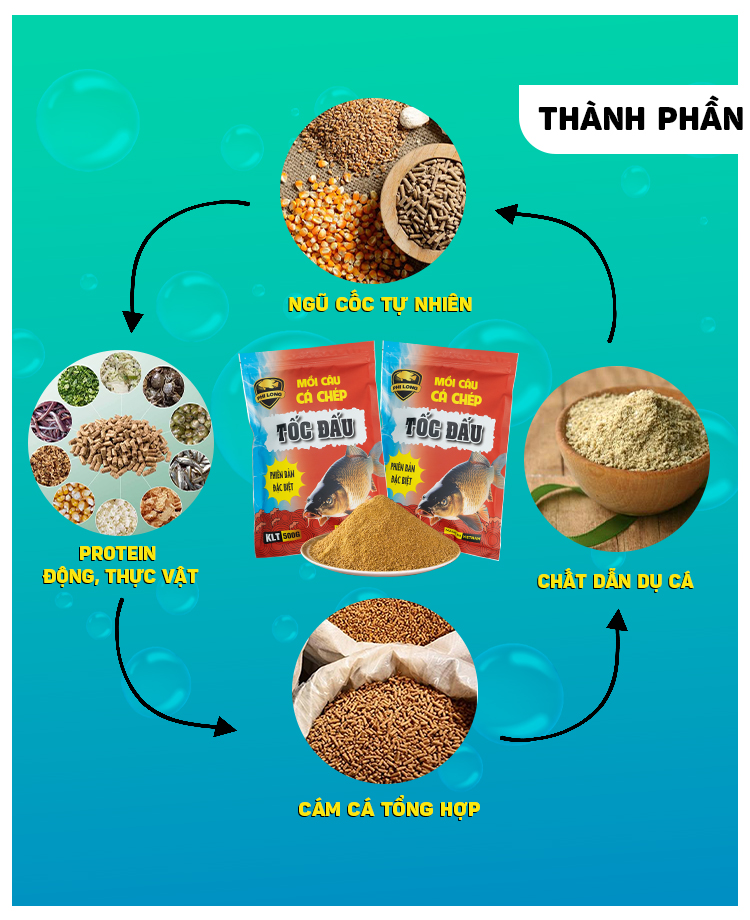 Mồi câu cá chép TỐC ĐẤU là sản phẩm cao cấp, được sản xuất từ các loại cám chăn nuôi trên thị trường kết hợp với các chất dẫn dụ khác. Với hàm lượng Protein từ 20 đến 30%, đây là hàm lượng protein phù hợp nhất dành cho cá chép, cám không chỉ thu hút cá nhanh mà còn giữ cá ở khu vực câu lâu hơn.