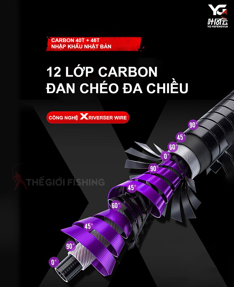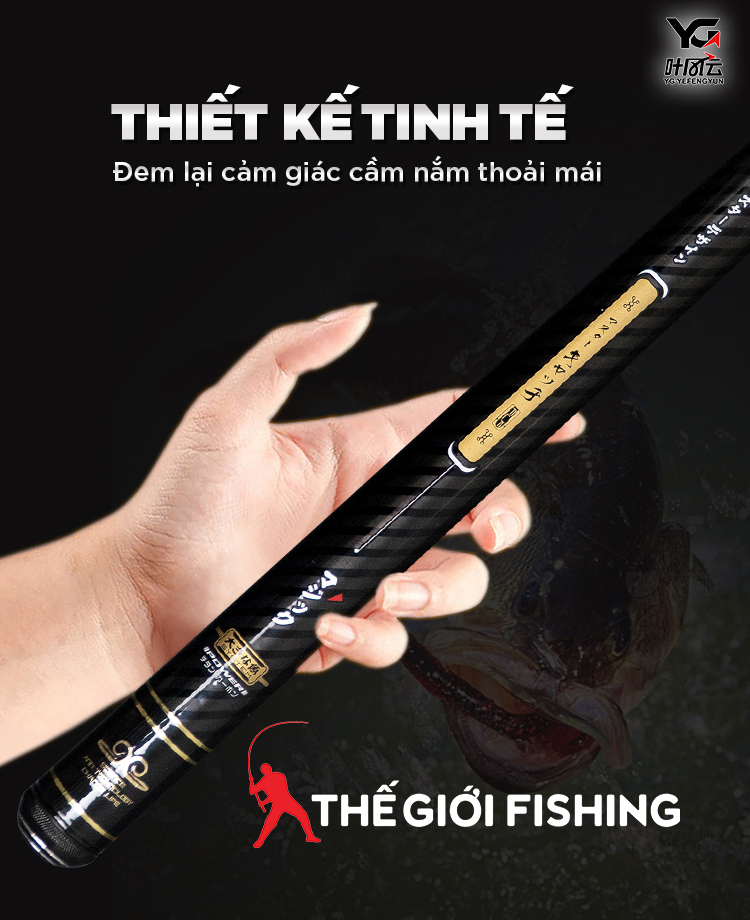 - Cần được làm từ vật liệu vải Carbon 40T + 46T nhập khẩu Nhật Bản đan chéo đa chiều mang lại sự dẻo dai, độ cứng cũng như sức mạnh của cây cần.